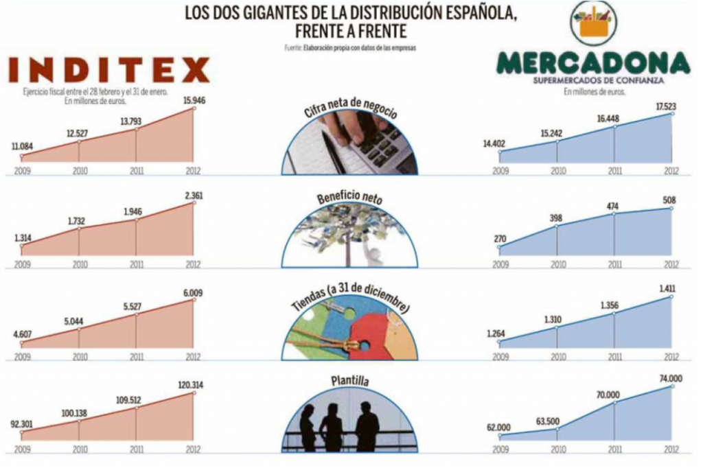 El grupo valenciano presidido por Juan Roig ha dado con un formato comercial en el ámbito de los supermercados que sin salir de España le permite facturar 17.523 millones, casi 1.600 millones más que el propietario de Zara, el grupo líder en textil con presencia en 86 países y una red de más de 6.000 tiendas. En 2012, en un año con el consumo nacional desplomado, Mercadona logró incrementar su beneficio neto un 7%, hasta los 508 millones; en tanto que, Inditex ganó 2.361 millones, un 22% más.