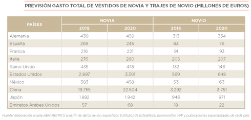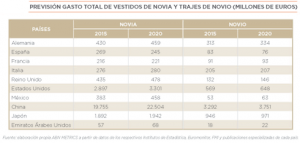 Con todo, el dato más significativo es que en el periodo 2007-2014 las exportaciones del sector, dirigidas en un 50% a países vecinos como Alemania, Francia, Italia y Portugal, registraron una tasa de crecimiento anual de casi el 13%. Destacan en este proceso de internacionalización las empresas catalanas, tanto por su peso en las exportaciones (el 40% de los vestidos de novia) como por su impronta en los mercados internacionales.